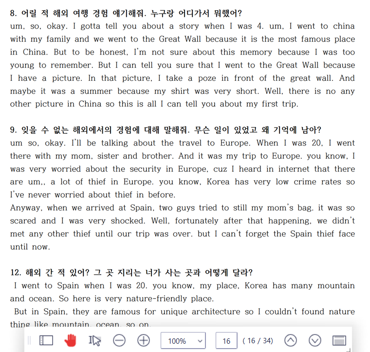 그리고 난 의식해서 중간 중간 대답 막힌 척하기도 하고 you know, as you know, you know what?, well 이런거 엄청 많이 썼다.